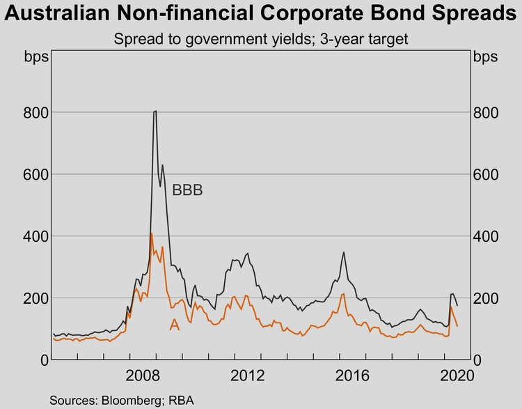 - Market pricing increased, as it always does in times of stressRefer the RBA chart below, which shows the increase in public market A/BBB spreads post pandemic, although not nearly to the same extent as during the 2008 GFC and that there is already a reduction in spreads occurring.